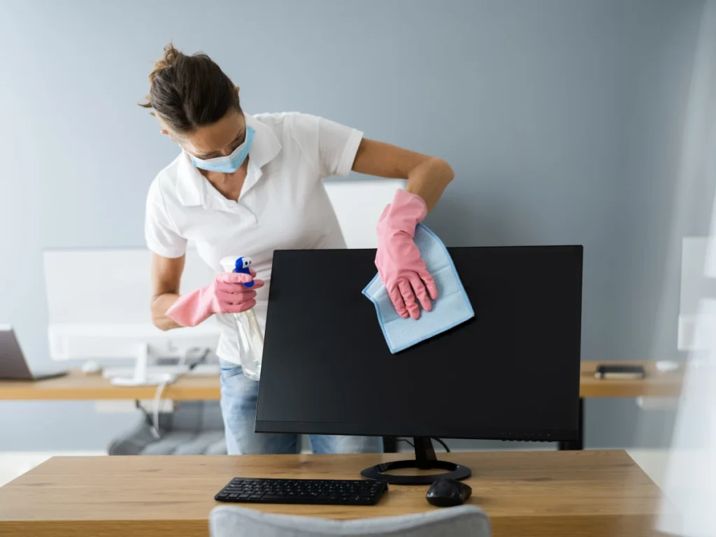 High-touch electronics surfaces may be wiped down carefully, but detailed electronic cleaning is handled with surface-safe methods only.